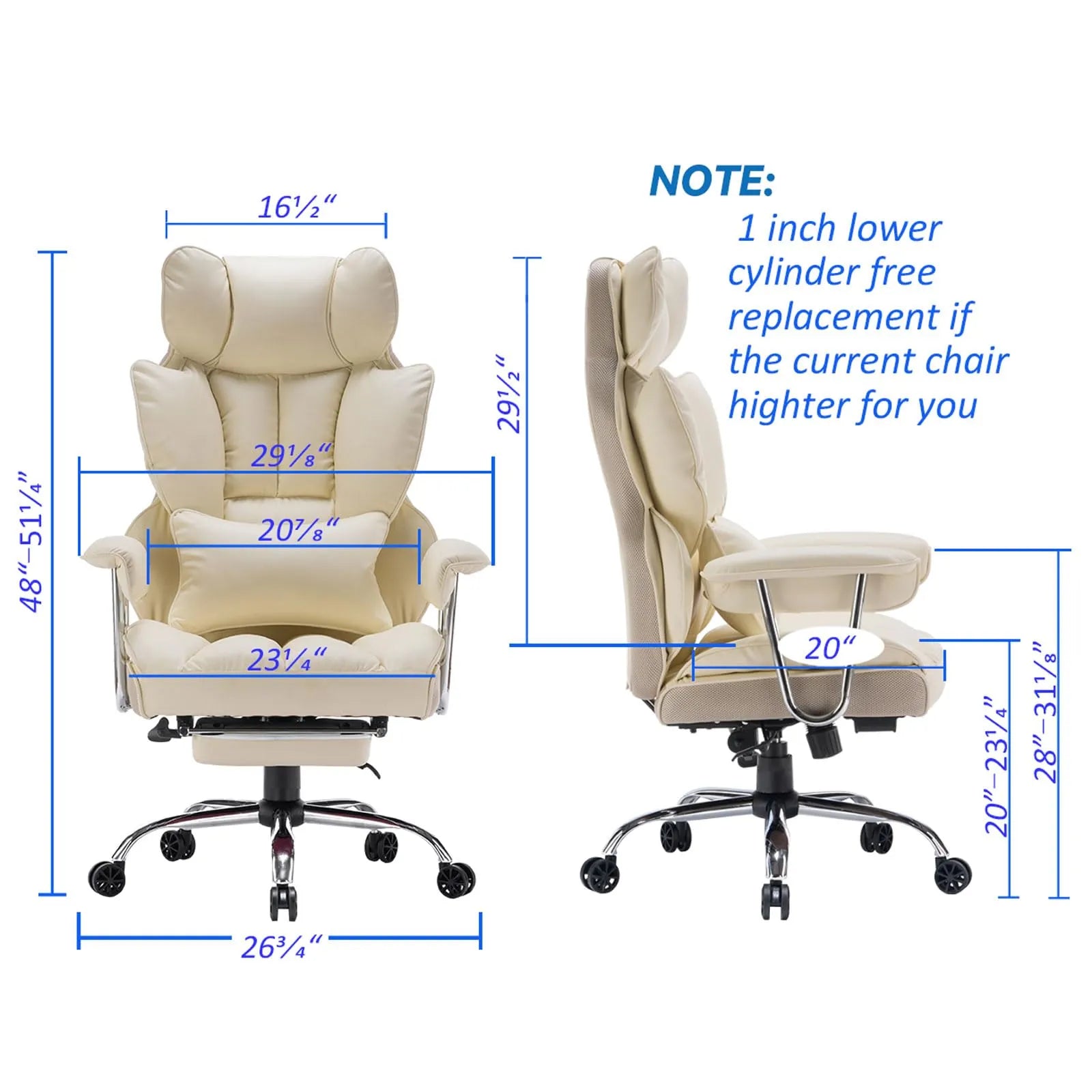 - 【Designed for big and tall】Say goodbye to discomfort and hello to a chair that understands your needs. Our excutive chair boasts a robust construction capable of handling up to 500 pounds. The thickened metal chassis and SGS 4 gas rod ensure stability and long-lasting performance, making it a reliable companion for your daily grind. The generously-sized seat cushion, equipped with an elastic spring pack, not only provides ample space but also ensures optimum support for extended periods of use