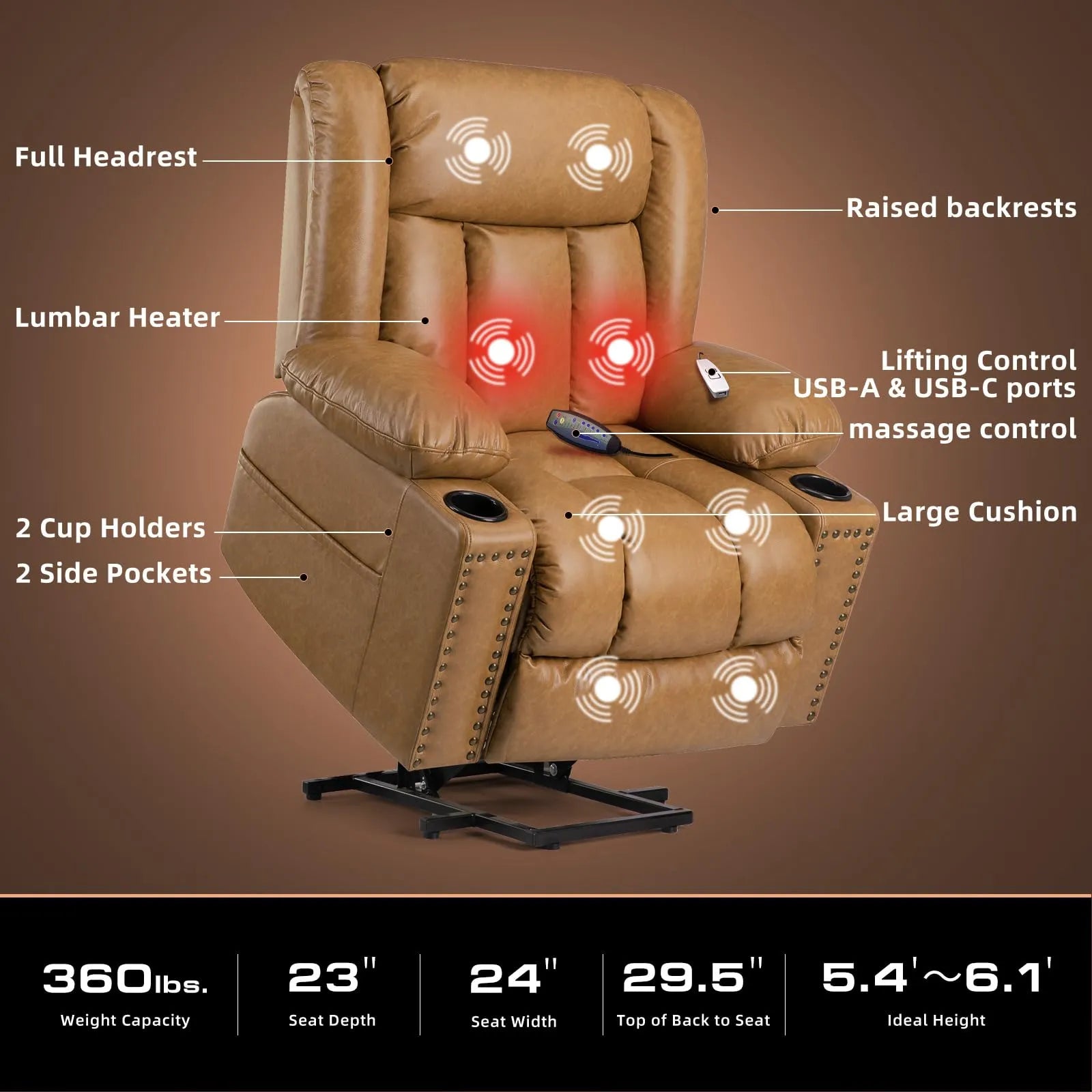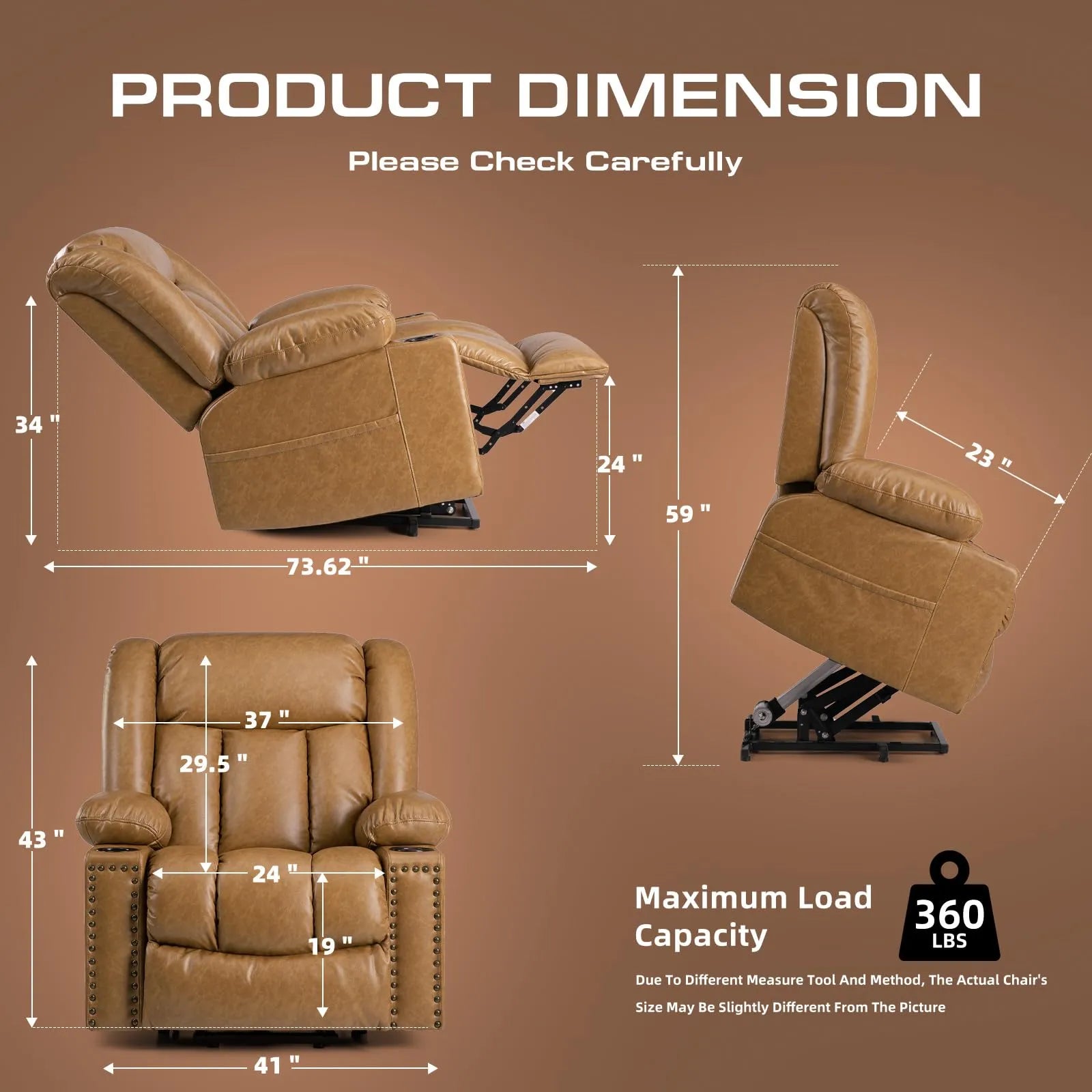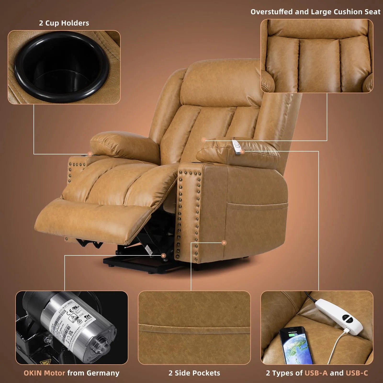 Large Power Lift Chairs Recliners for Elderly with Heat and Massage Set of 2, Breathable Leather, USB-A USB-C, Cup Holder, Side Pocket, Caramel