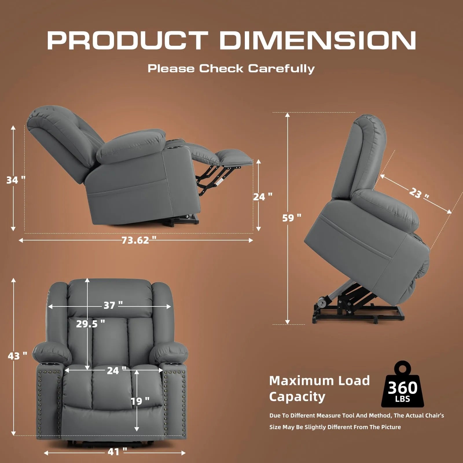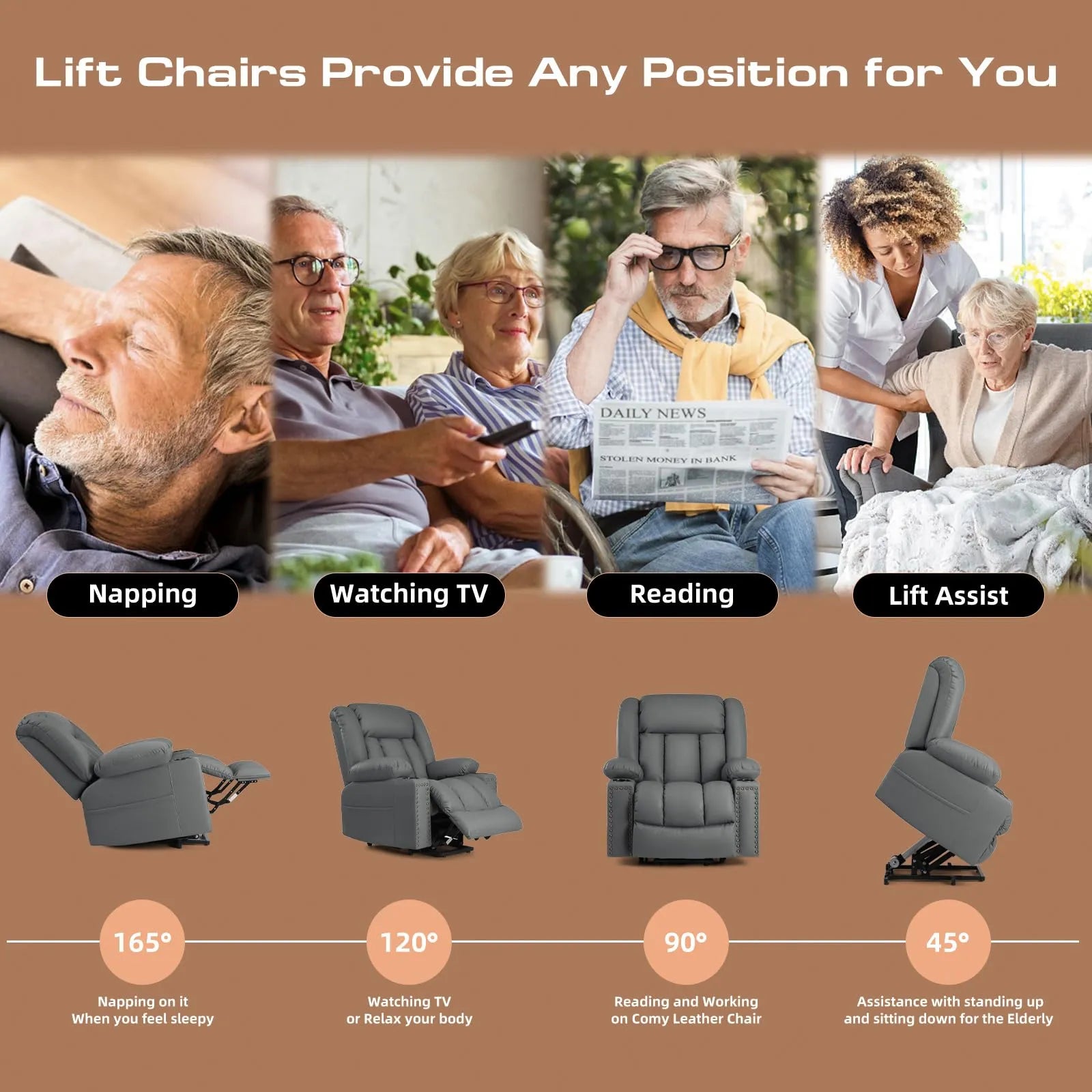 - 【Adjustable to Any Position】Power Lift Recliner Adjust to Any Angle You Need(45°-165°), to meet your different needs, like reading a book, watching TV, going to bed, or getting up for leaving. Our lift chairs are equipped with a lift remote control, which Avoids the issue of not being able to reach the lift button on the armrest when lying down. Additionally, Based on SGS testing, Button replacing the remote control resulted in a 72% decrease in chair malfunction rates.