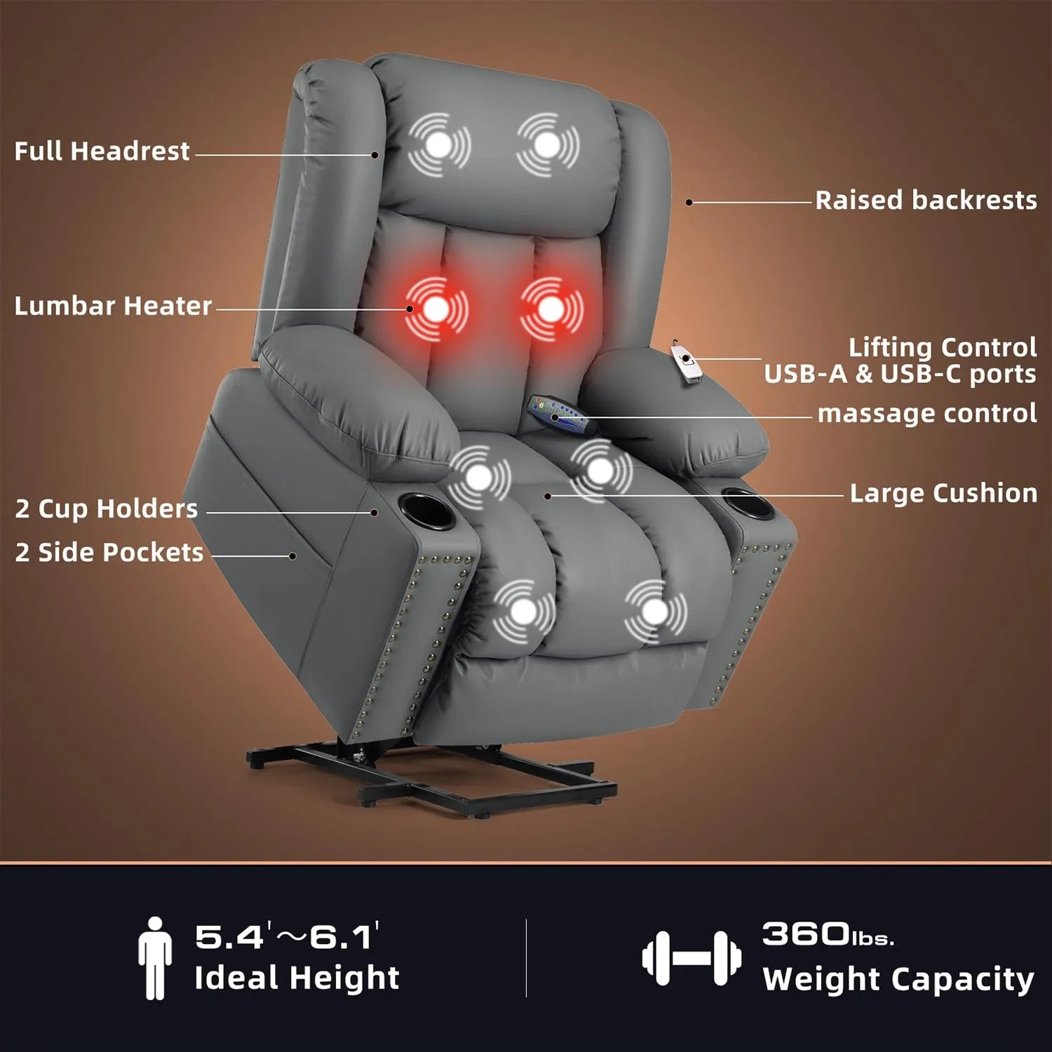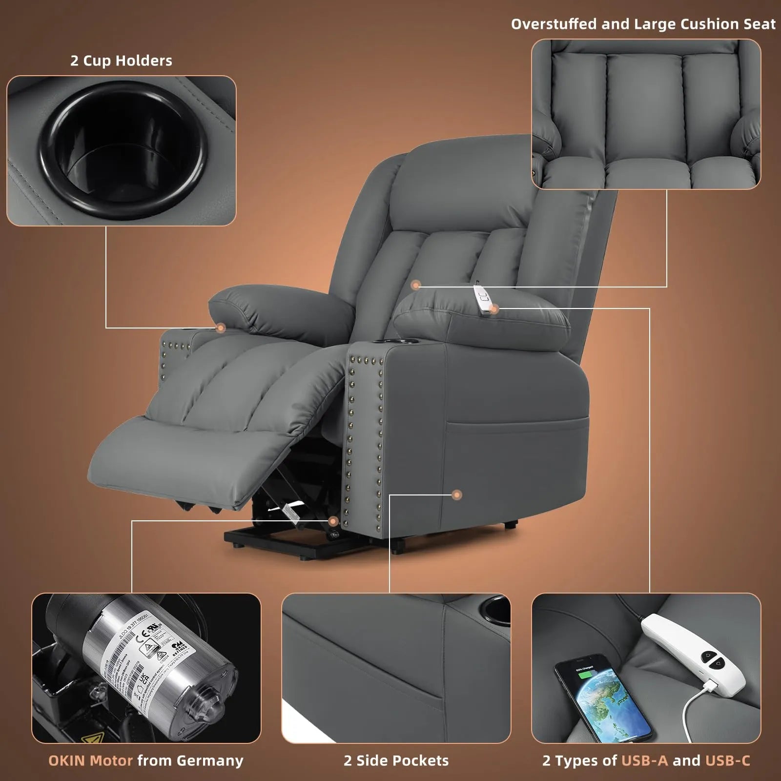 Large Power Lift Chairs Recliners for Elderly with Heat and Massage Set of 2, Breathable Leather, USB-A USB-C, Cup Holder, Side Pocket Grey