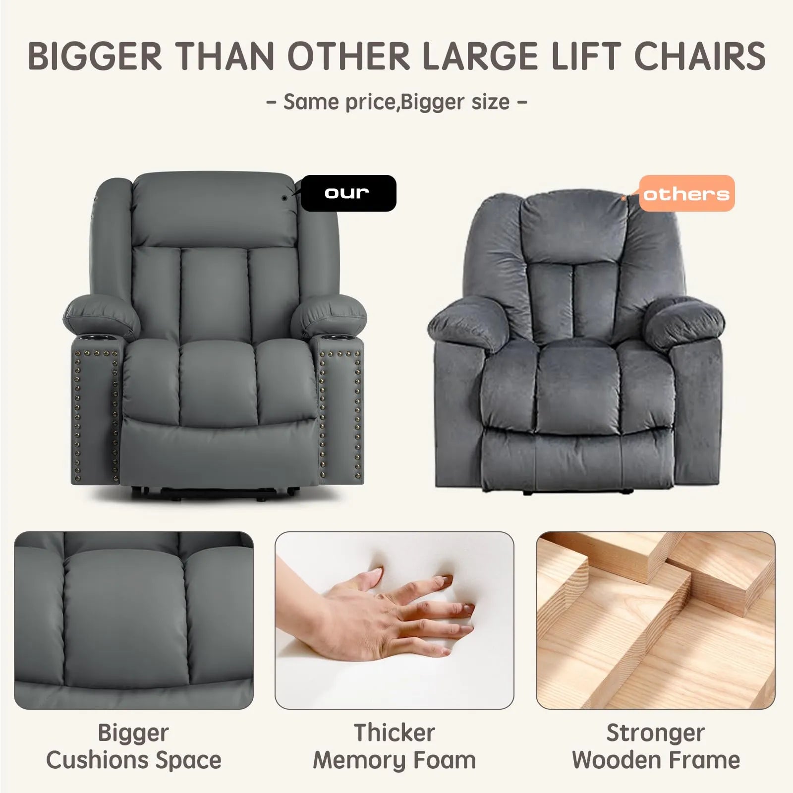 - 【Upgrades Size】Our power lift recliner has a Bigger Cushion and Longer Backrest, increased the backrest height to 29.5" and the cushion area to 23*24", Overall size is 39.4"*40.9"*43", Some other large lift chairs measure 38"*39"*42" inches, these recliner chairs look big, but the seating area is still 20"*22", They just widened the handrails, This is meaningless.