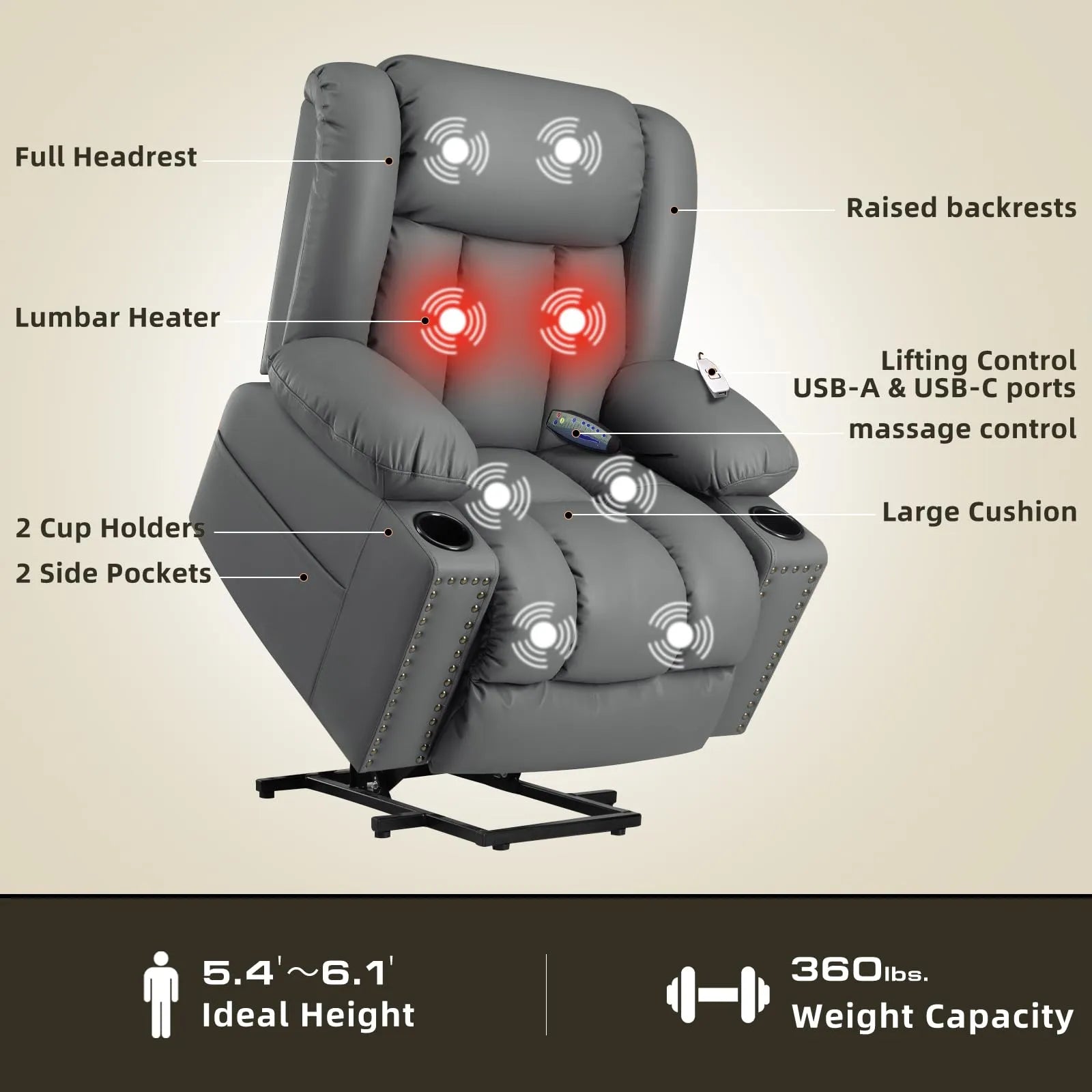- 【Massage & Heat】Power lift recliner comes with 8 vibration points on the back, lumbar, thigh, and leg; 5 vibration modes (pulse, press, wave, auto, and normal) with 2 intensities. There is an Automatical heating system on the lumbar area, the temperature range is 113℉ to 140℉ When it reaches 140℉, it will automatically turn off and keep cool to 113℉ before heating.