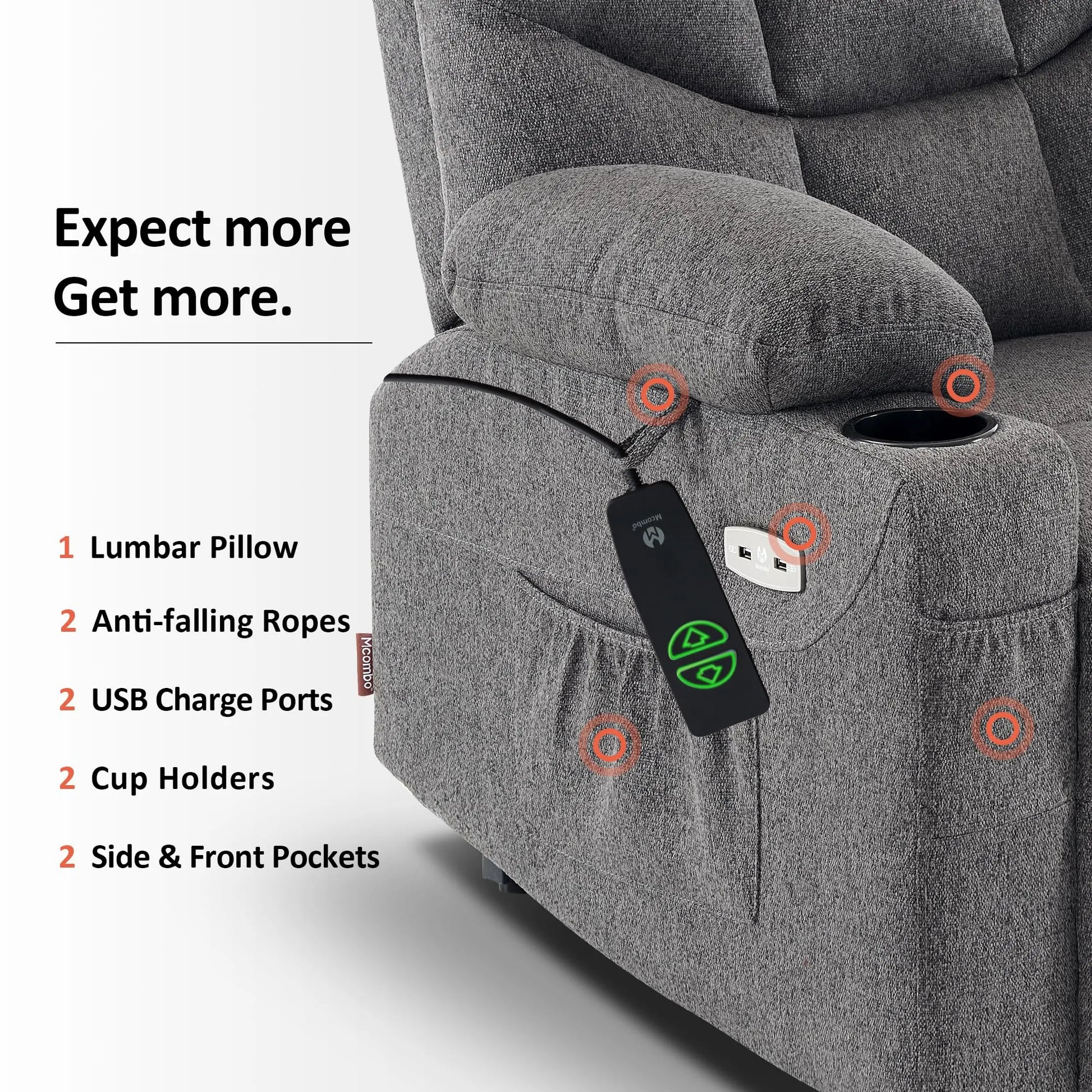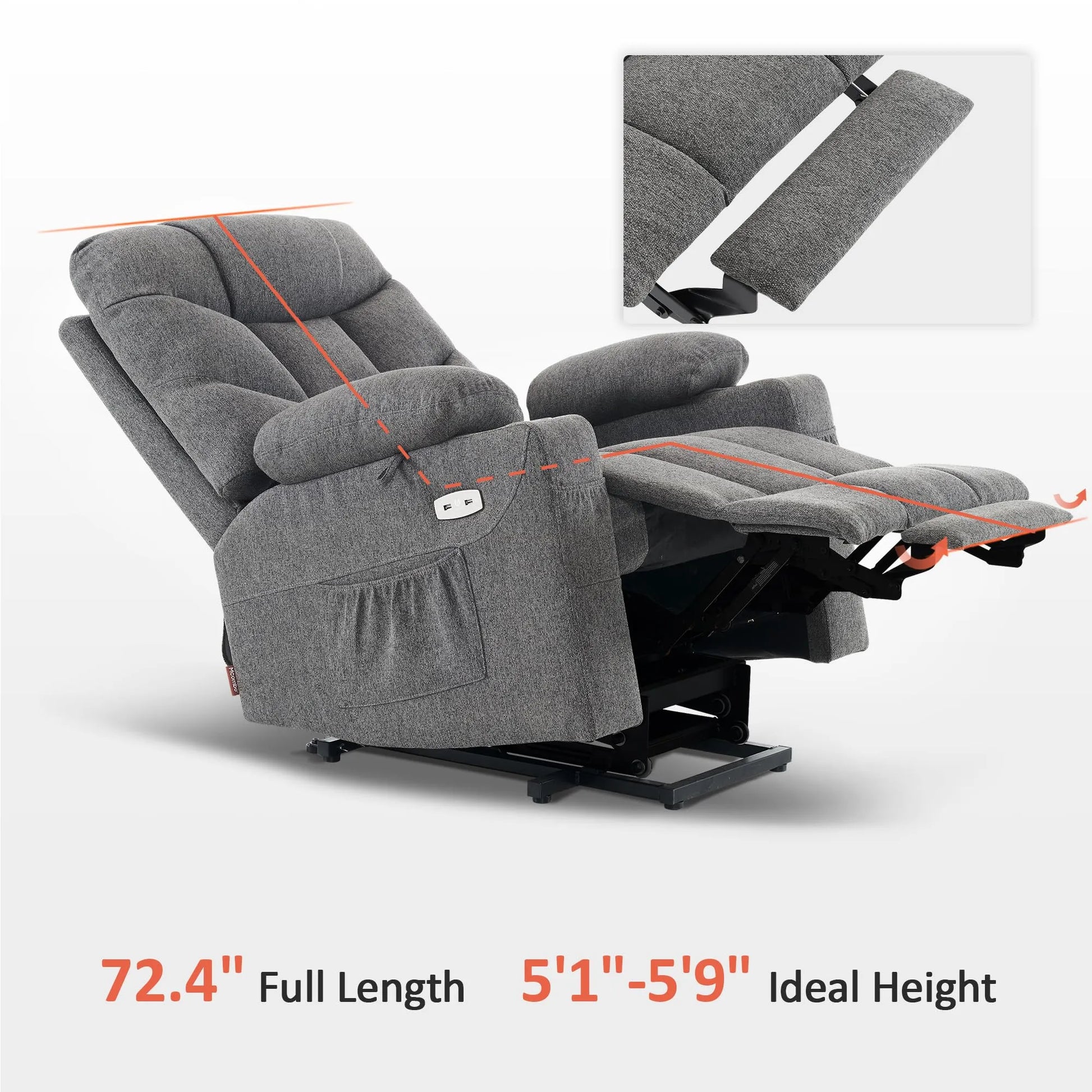 - Power Lift Assistance: Counter-balanced lift mechanism to assist the senior stand up easily, smoothly adjust to lift or reclining position you prefer by pressing buttons (Max reclining angle: 140°)